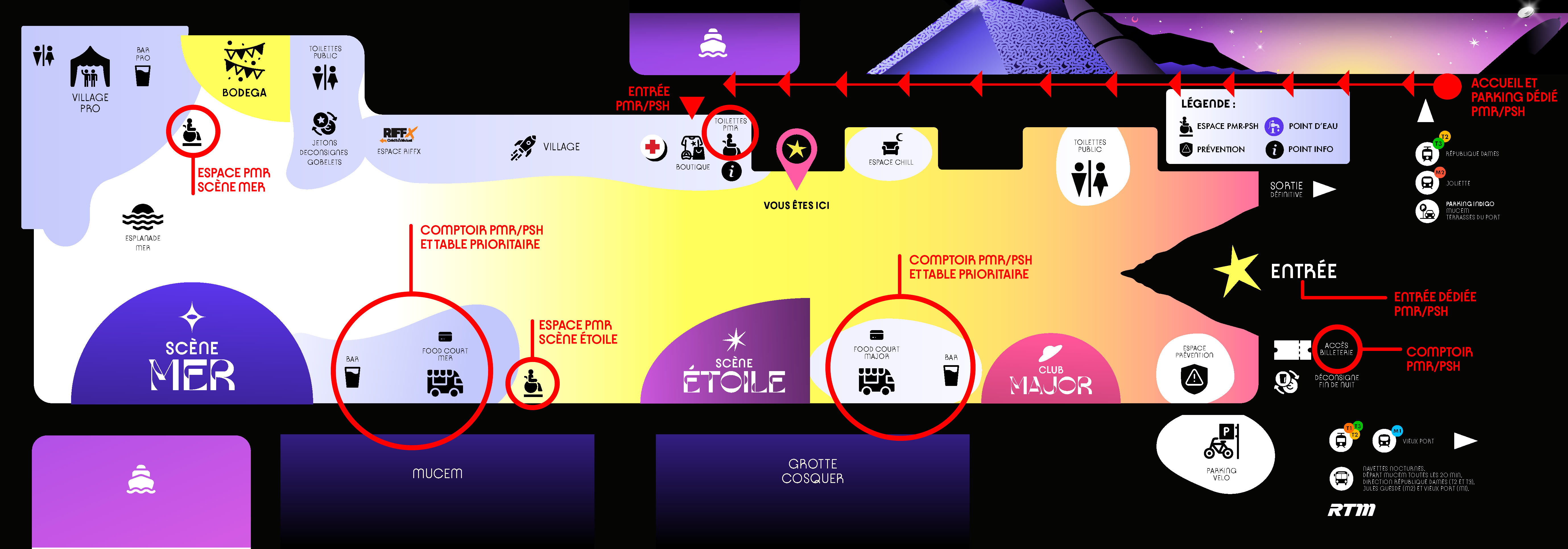 Parking réservé et dépose-minute : Un parking avec un nombre limité de places est disponible sur réservation. Une zone de dépose-minute est également accessible pendant toute la durée du festival. Ce parking est complet pour la soirée du Jeudi 09 octobre mais le parking Indigo Vieux-Port fort Saint-Jean dispose de places PMR réservées. Un ascenseur permet d’accéder à l’Esplanade du J4.