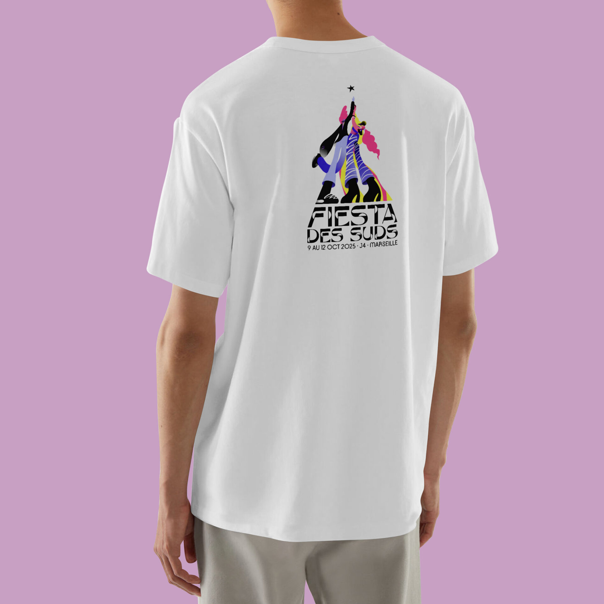 T-shirt blanc unisexe en coton bio ultra-doux avec impression sérigraphie Fiesta des Suds 2024.
